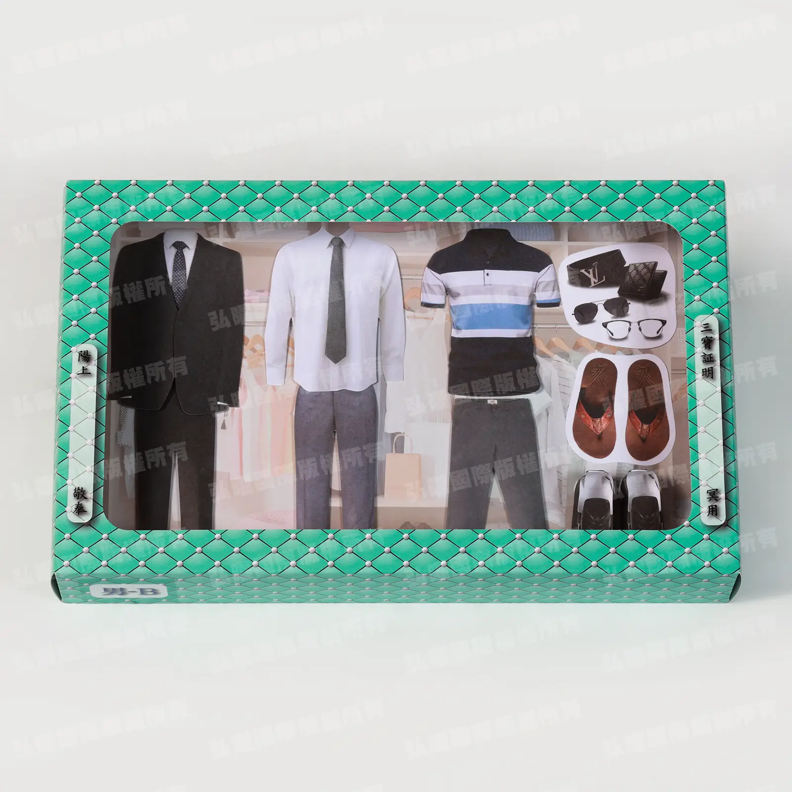紙紮男士用品象徵「格調長存」,寓意讓往生者於陰間依舊擁有生活所需與專屬用品,體現尊榮與格調。
